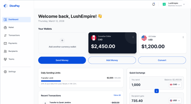 Dicepay allows you to send money globally with competitive exchange rates and low fees. Simply create an account, verify your identity, add funds, and send money to your recipients across multiple countries.